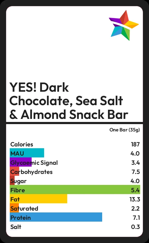 YES! Dark Chocolate, Sea Salt & Almond Snack Bar contains 186.6 calories in one Bar (35g).
