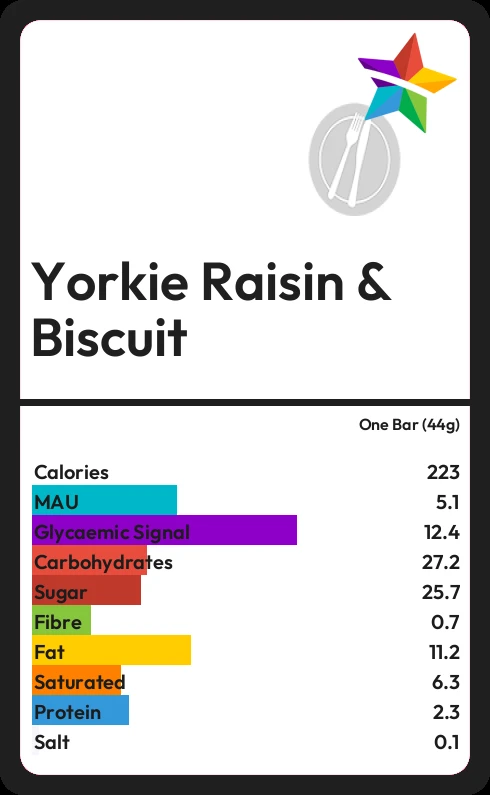 Yorkie Raisin & Biscuit contains 223.5 calories in one Bar (44g).