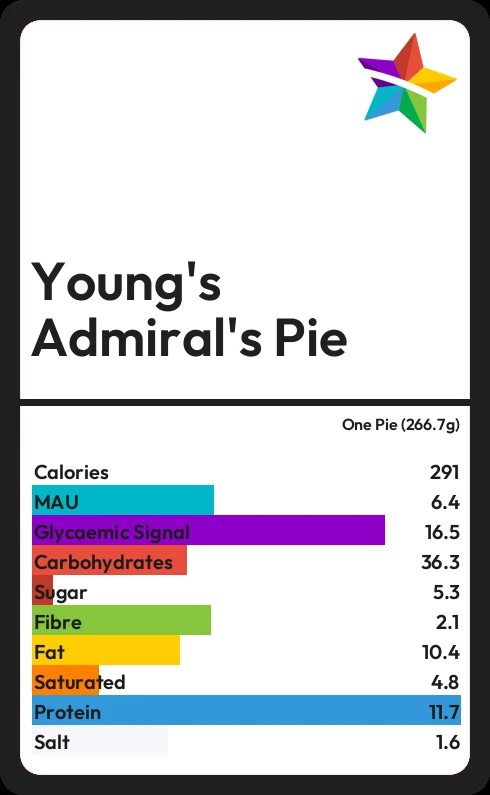 In one Pie (266.7g) of Young's Admiral's Pie there are 10.4g of fat of which 4.8g are saturated.