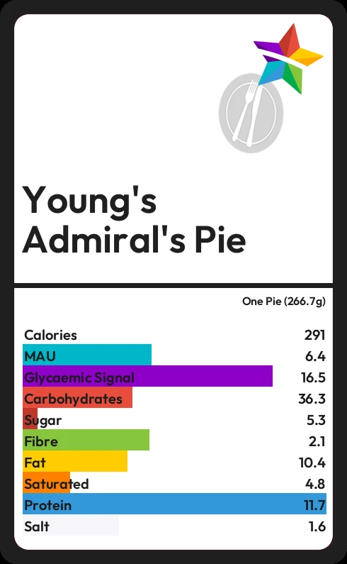 In one Pie (266.7g) of Young's Admiral's Pie there are 10.4g of fat of which 4.8g are saturated.