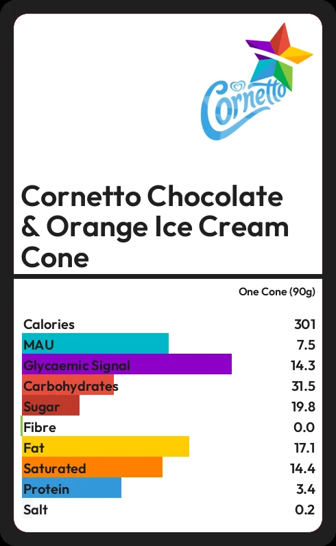 Cornetto Chocolate & Orange Ice Cream Cone contains 19.8g sugar in one Cone (90g) - that is around 5 cubes of sugar.