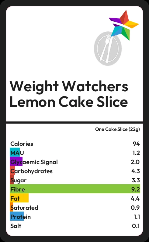 Weight Watchers Lemon Cake Slice contains 94.4 calories in one Cake Slice (22g).