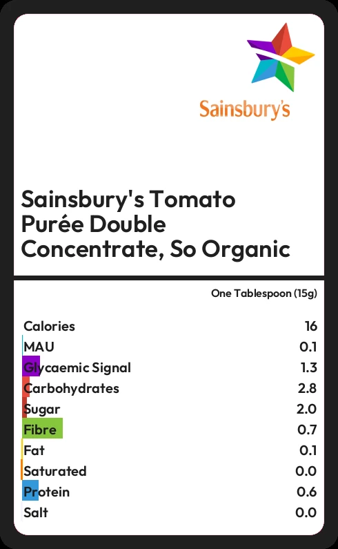 Sainsbury's Tomato Purée Double Concentrate, So Organic contains 15.6 calories in one Tablespoon (15g).