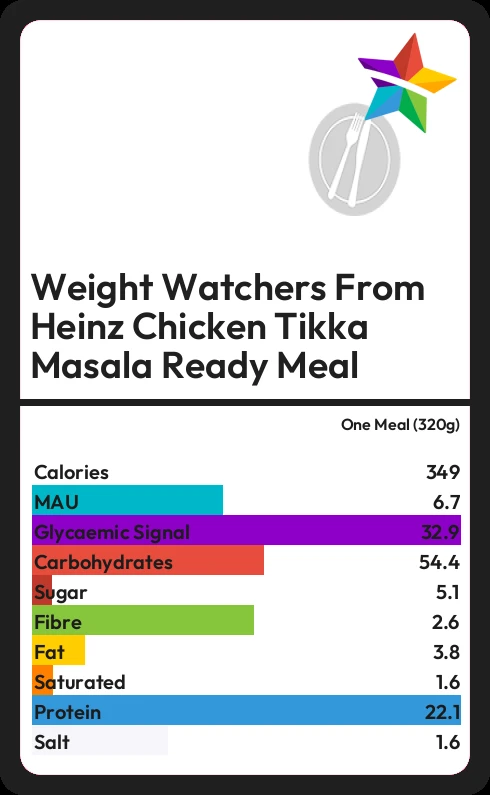 Weight Watchers From Heinz Chicken Tikka Masala Ready Meal contains 348.8 calories in one Meal (320g).