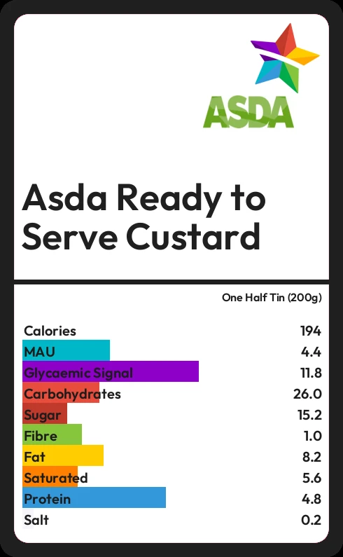 Asda Ready to Serve Custard contains 194 calories in one Half Tin (200g).