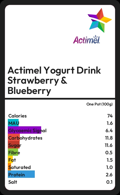 Actimel Yogurt Drink Strawberry & Blueberry contains 11.6g sugar in one Pot (100g) - that is around 3 cubes of sugar.