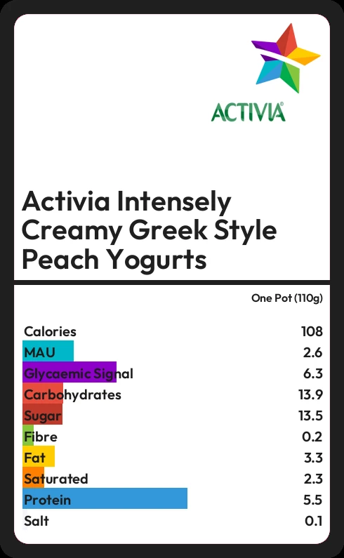 Activia Intensely Creamy Greek Style Peach Yogurts contains 13.5g sugar in one Pot (110g) - that is around 3 cubes of sugar.
