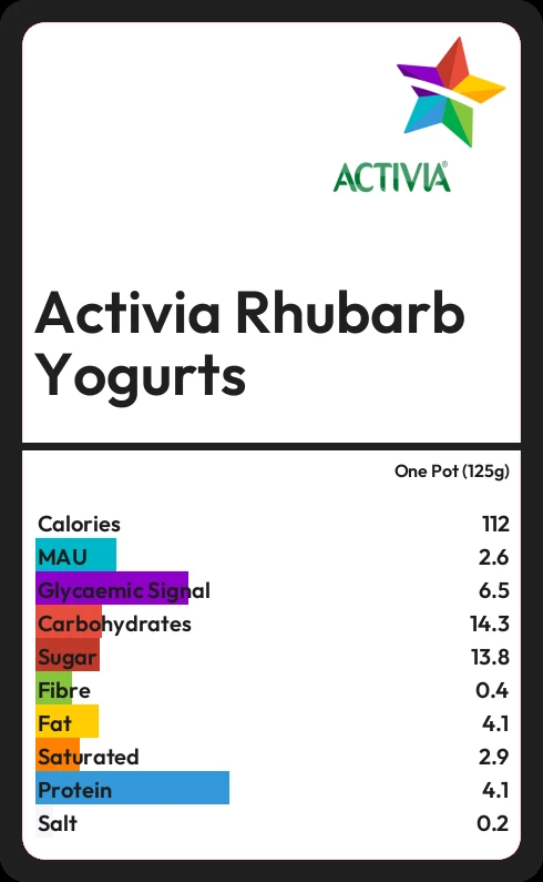 Activia Rhubarb Yogurts contains 111.3 calories in one Pot (125g).