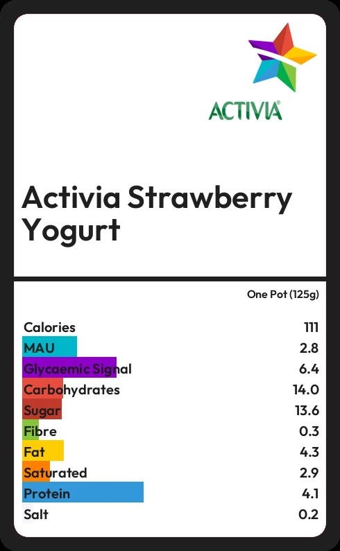 Activia Strawberry Yogurt contains 111.3 calories in one Pot (125g).