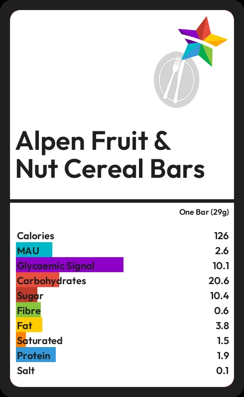 Alpen Fruit & Nut Cereal Bars contains 10.4g sugar in one Bar (29g) - that is around 3 cubes of sugar.