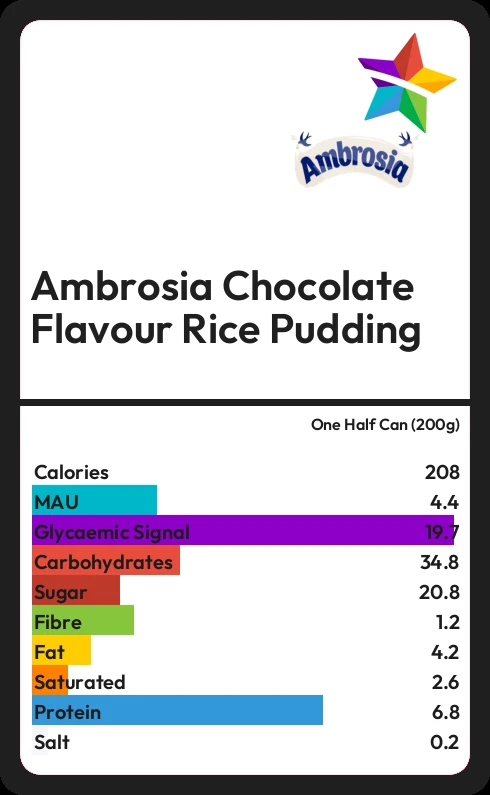 Ambrosia Chocolate Flavour Rice Pudding contains 208 calories in one Half Can (200g).