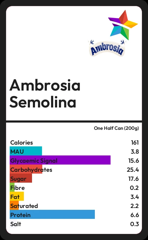Ambrosia Semolina contains 17.6g sugar in one Half Can (200g) - that is around 4 cubes of sugar.