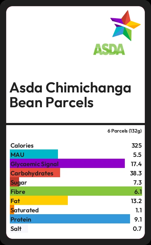 Asda Chimichanga Bean Parcels contains 324.7 calories in 6 Parcels (132g).