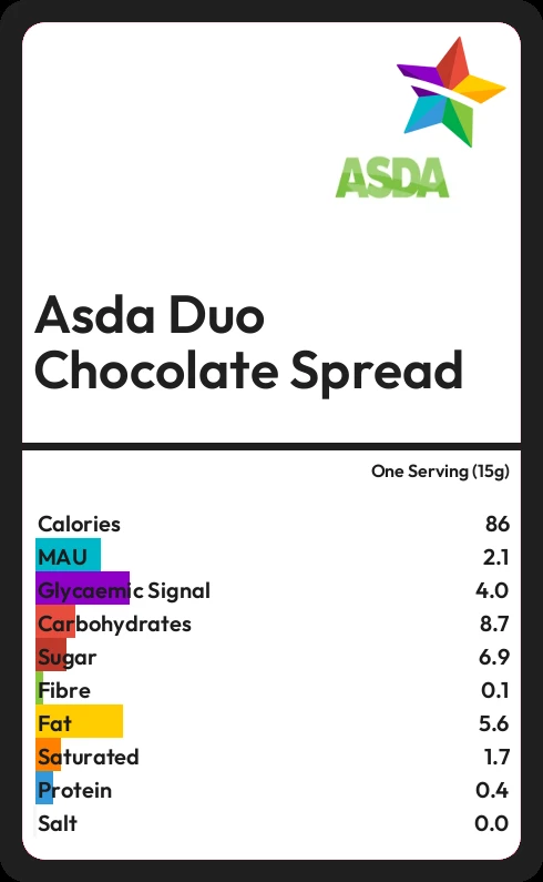 In one Serving (15g) of Asda Duo Chocolate Spread there are 5.6g of fat of which 1.7g are saturated.