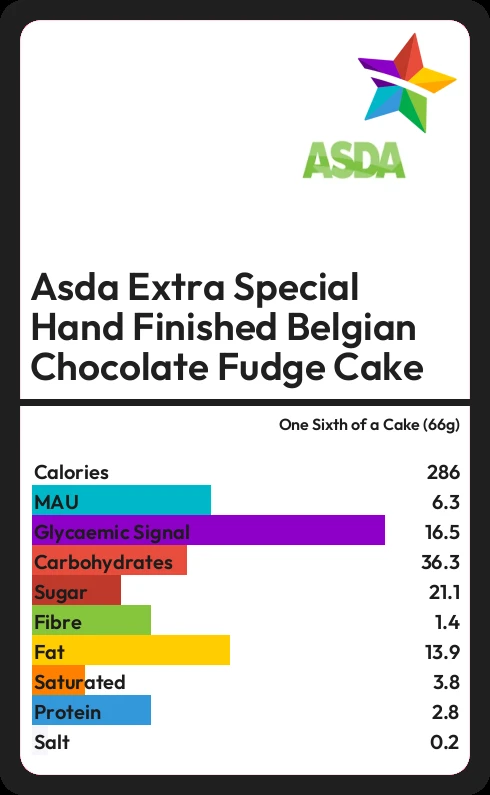Asda Extra Special Hand Finished Belgian Chocolate Fudge Cake contains 21.1g sugar in one Sixth of a Cake (66g) - that is around 5 cubes of sugar.