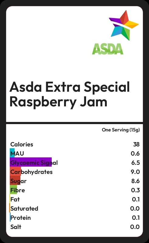 Asda Extra Special Raspberry Jam contains 38.1 calories in one Serving (15g).