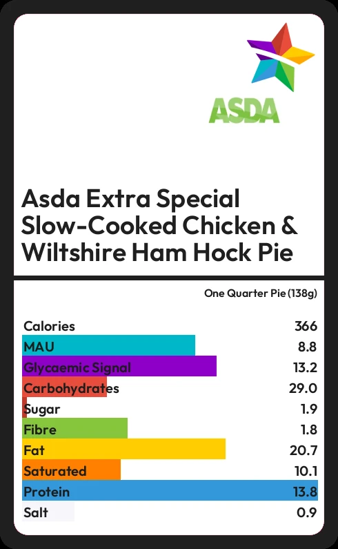 Asda Extra Special Slow-Cooked Chicken & Wiltshire Ham Hock Pie contains 1.9g sugar in one Quarter Pie (138g)