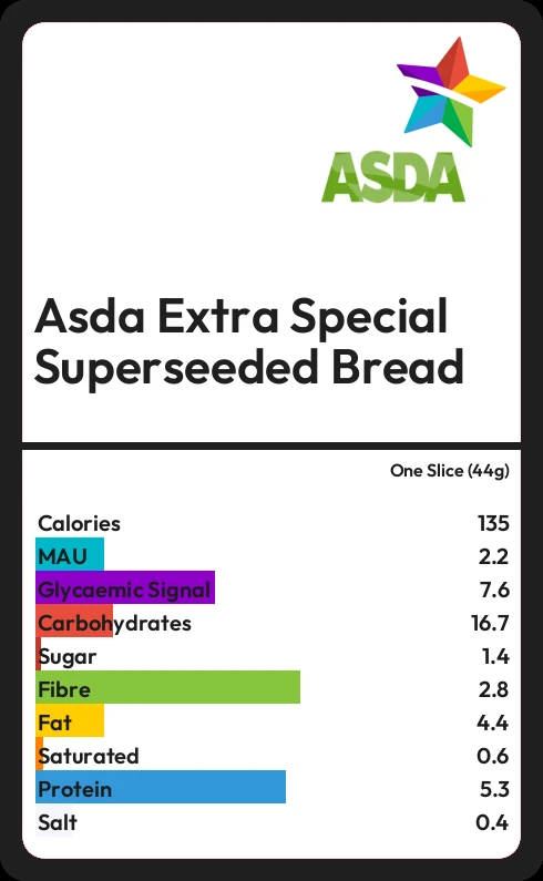 Asda Extra Special Superseeded Bread contains 1.4g sugar in one Slice (44g)