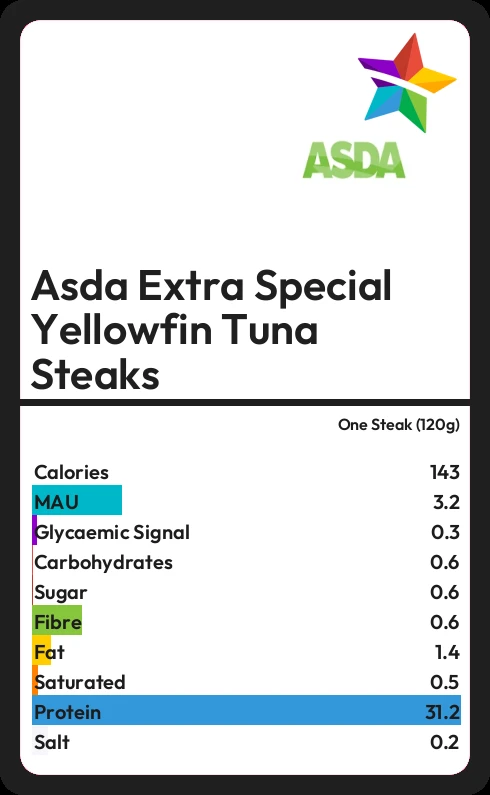 Asda Extra Special Yellowfin Tuna Steaks contains 0.6g sugar in one Steak (120g)