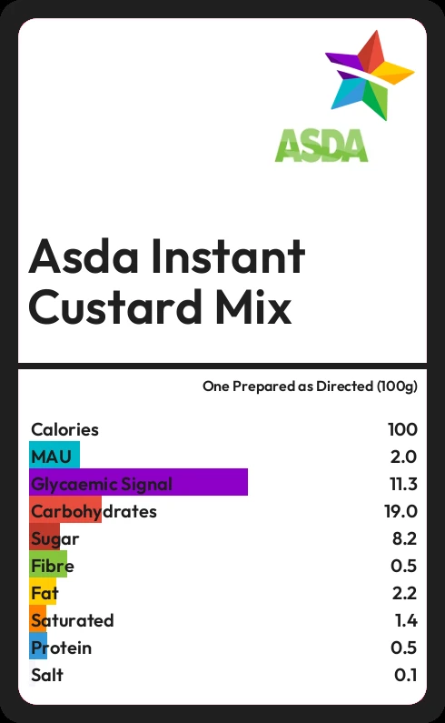 Asda Instant Custard Mix contains 100 calories in one Prepared as Directed (100g).