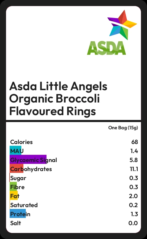 Asda Little Angels Organic Broccoli Flavoured Rings contains 0.3g sugar in one Bag (15g)