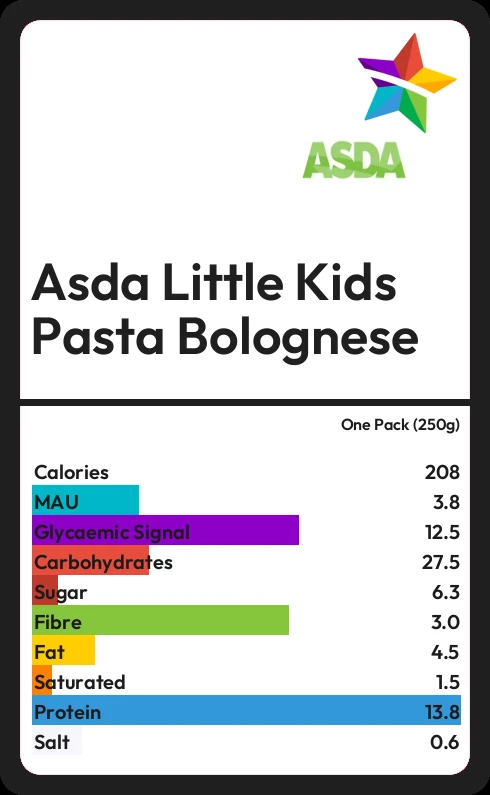 Asda Little Kids Pasta Bolognese contains 207.5 calories in one Pack (250g).