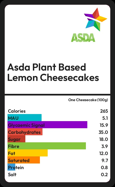 Asda Plant Based Lemon Cheesecakes contains 265 calories in one Cheesecake (100g).