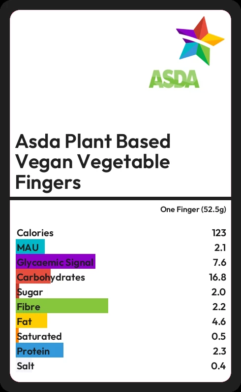 Asda Plant Based Vegan Vegetable Fingers contains 122.9 calories in one Finger (52.5g).