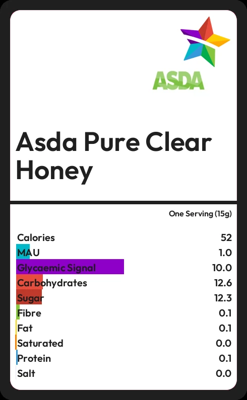 Asda Pure Clear Honey contains 51.9 calories in one Serving (15g).