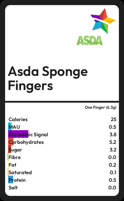 Asda Sponge Fingers contains 25.1 calories in one Finger (6.3g).