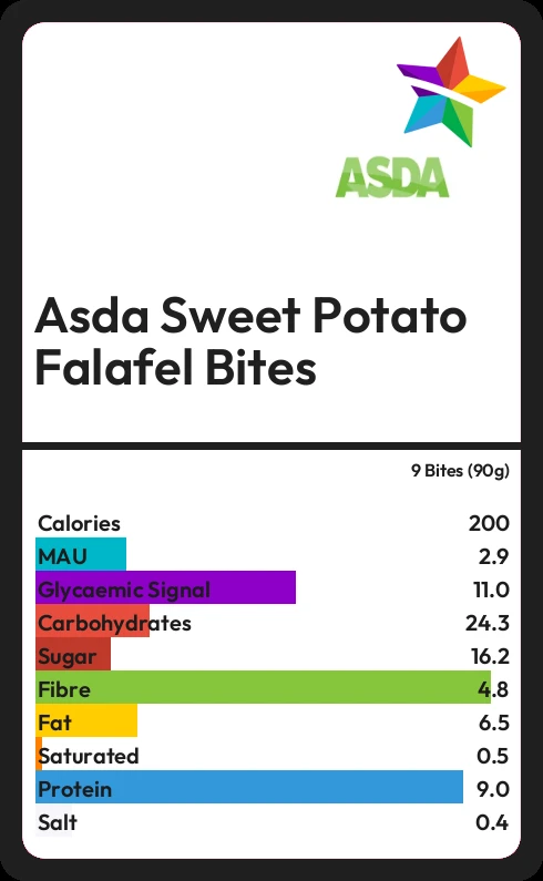 Asda Sweet Potato Falafel Bites contains 16.2g sugar in 9 Bites (90g) - that is around 4 cubes of sugar.