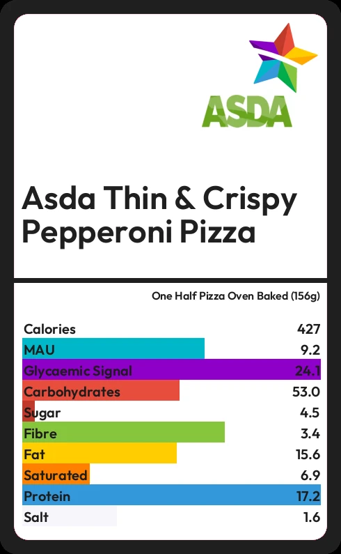 Asda Thin & Crispy Pepperoni Pizza contains 427.4 calories in one Half Pizza Oven Baked (156g).