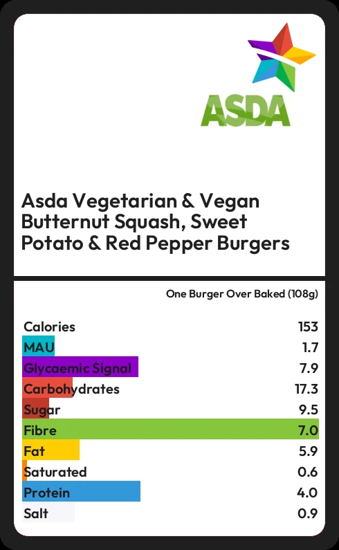 Asda Vegetarian & Vegan Butternut Squash, Sweet Potato & Red Pepper Burgers contains 153.4 calories in one Burger Over Baked (108g).