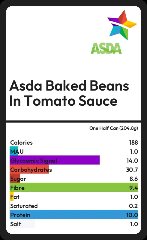 Asda Baked Beans In Tomato Sauce contains 188.4 calories in one Half Can (204.8g).