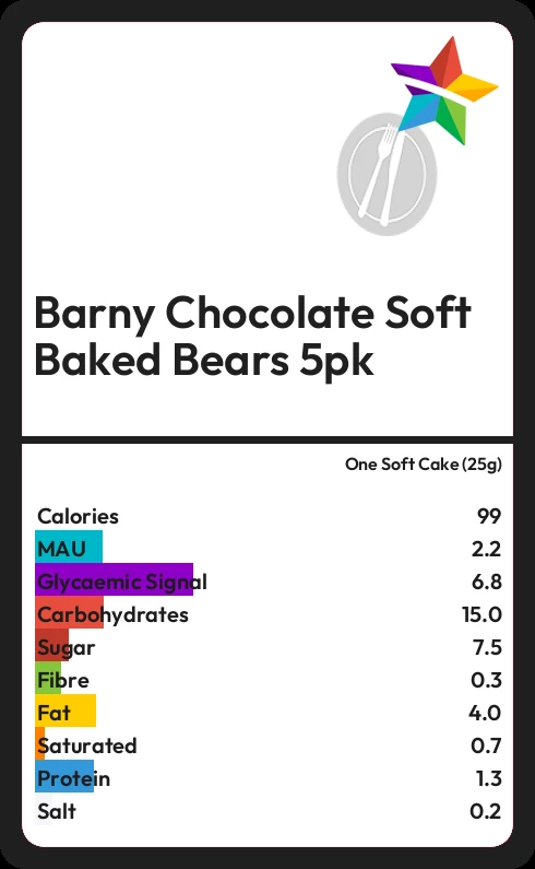 Barny Chocolate Soft Baked Bears 5pk contains 7.5g sugar in one Soft Cake (25g) - that is around 2 cubes of sugar.