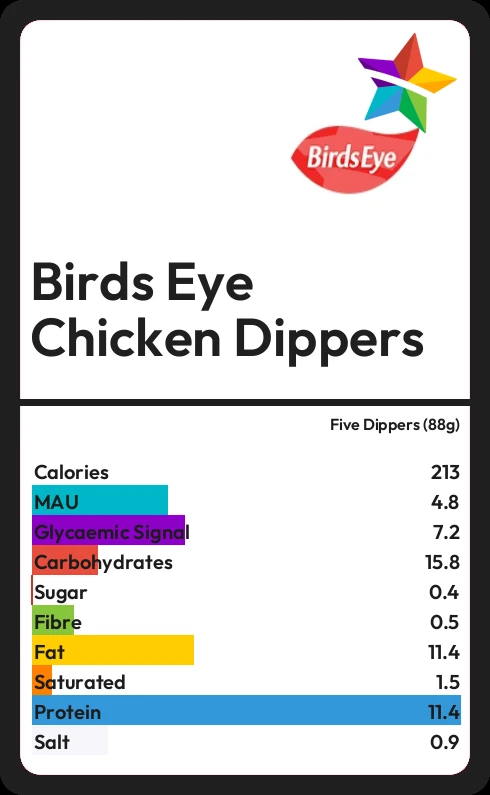 Birds Eye Chicken Dippers contains 0.4g sugar in five Dippers (88g)