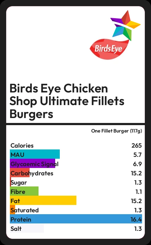 Birds Eye Chicken Shop Ultimate Fillets Burgers contains 264.4 calories in one Fillet Burger (117g).