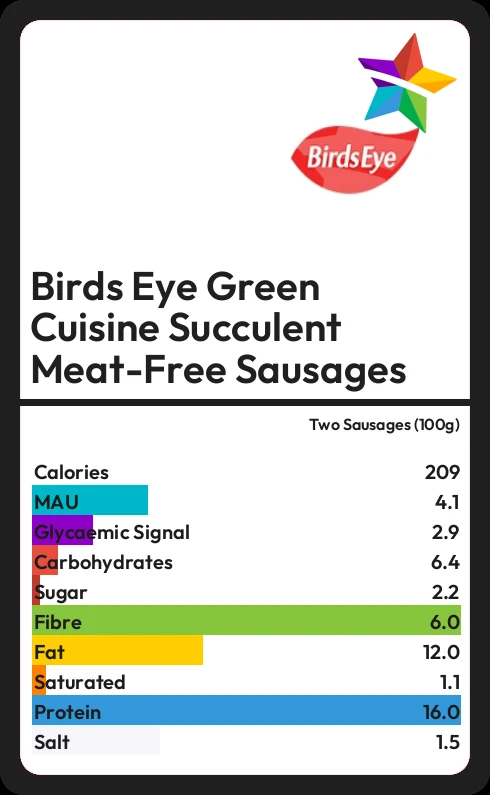 Birds Eye Green Cuisine Succulent Meat-Free Sausages contains 209 calories in two Sausages (100g).