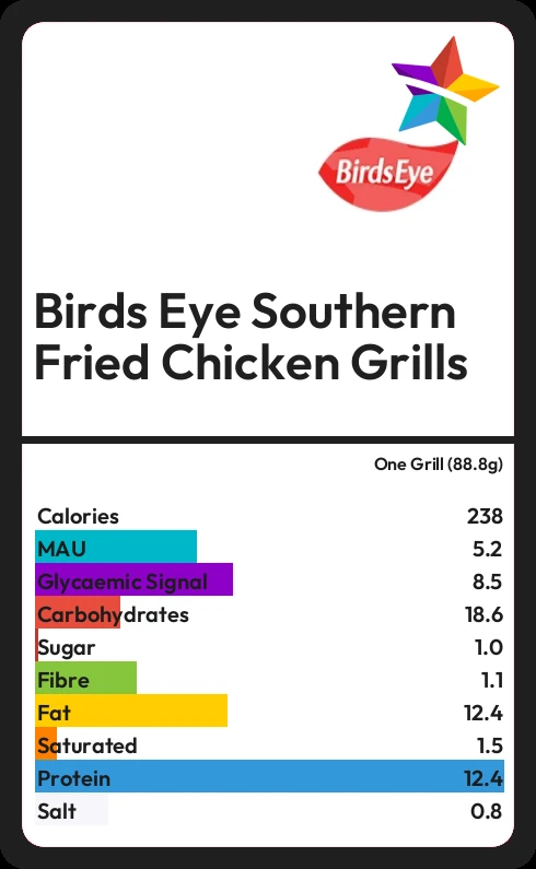 Birds Eye Southern Fried Chicken Grills contains 1.0g sugar in one Grill (88.8g)