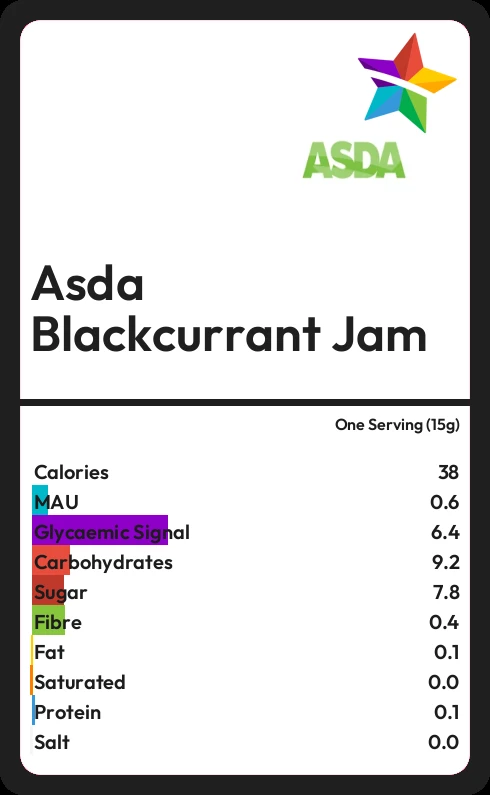 Asda Blackcurrant Jam contains 38.1 calories in one Serving (15g).