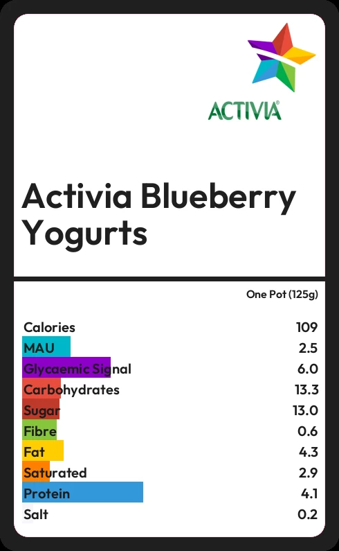 Activia Blueberry Yogurts contains 108.8 calories in one Pot (125g).