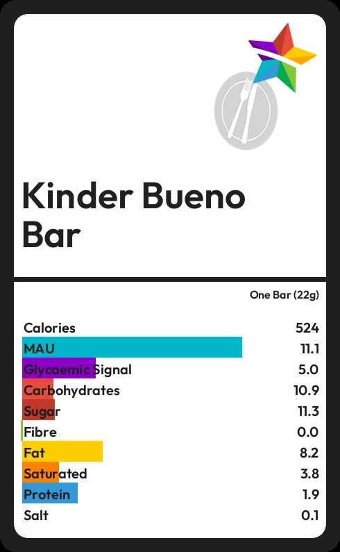 Kinder Bueno Bar contains 11.3g sugar in one Bar (22g) - that is around 3 cubes of sugar.