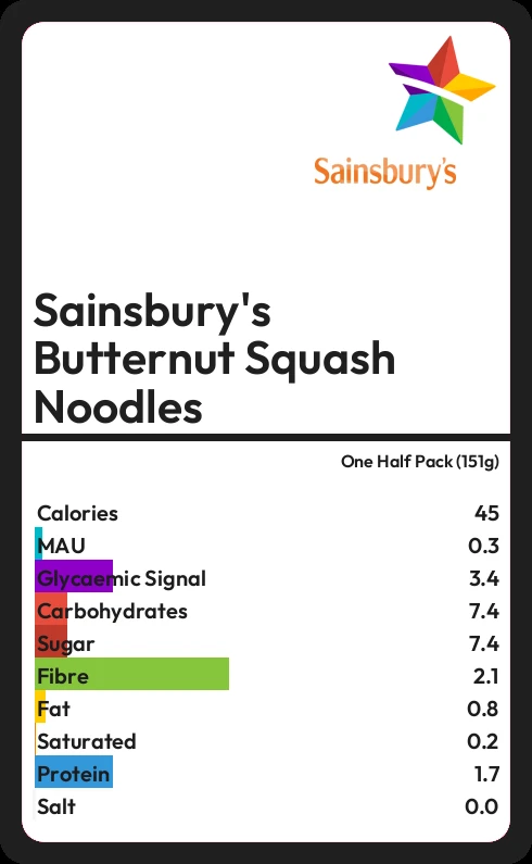 Sainsbury's Butternut Squash Noodles contains 45.3 calories in one Half Pack (151g).