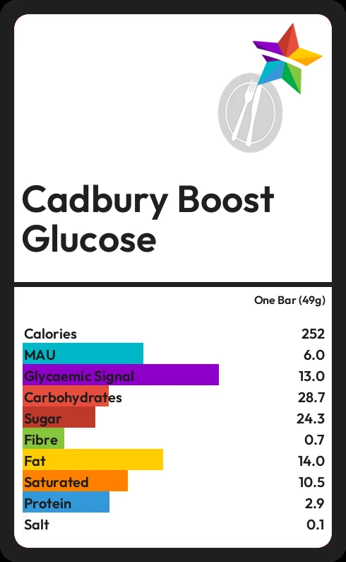 Cadbury Boost Glucose contains 24.3g sugar in one Bar (49g) - that is around 6 cubes of sugar.
