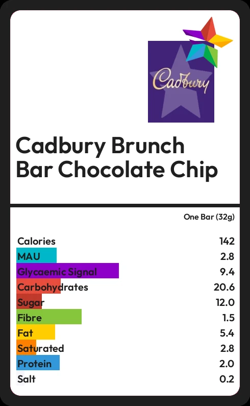 Cadbury Brunch Bar Chocolate Chip contains 142.1 calories in one Bar (32g).