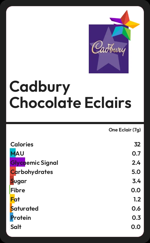 Cadbury Chocolate Eclairs contains 3.4g sugar in one Eclair (7g) - that is around 1 cube of sugar.