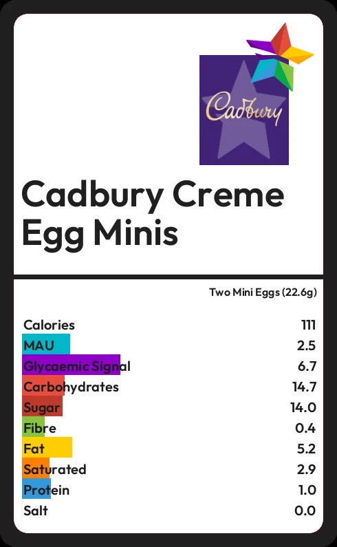 Cadbury Creme Egg Minis contains 14.0g sugar in two Mini Eggs (22.6g) - that is around 4 cubes of sugar.
