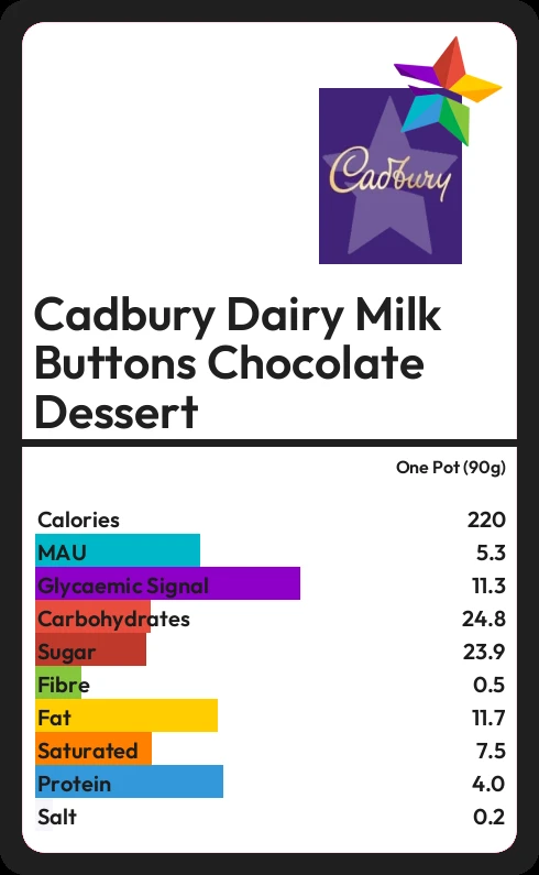 Cadbury Dairy Milk Buttons Chocolate Dessert contains 23.9g sugar in one Pot (90g) - that is around 6 cubes of sugar.