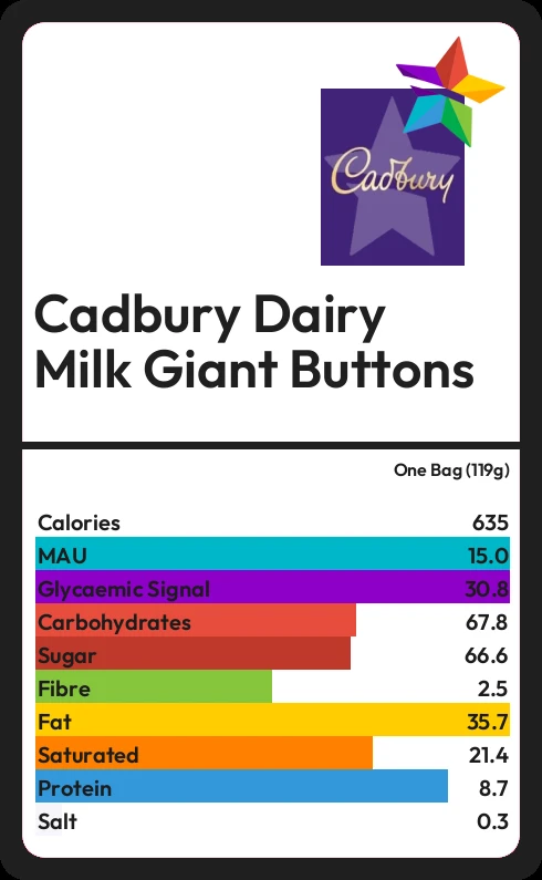 Cadbury Dairy Milk Giant Buttons contains 66.6g sugar in one Bag (119g) - that is around 17 cubes of sugar.