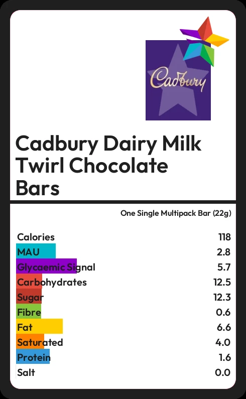 Cadbury Dairy Milk Twirl Chocolate Bars contains 12.3g sugar in one Single Multipack Bar (22g) - that is around 3 cubes of sugar.